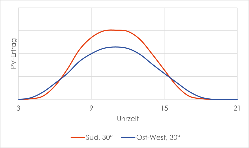 Vor allem in den Randzeiten (am frühen Vormittag und am späten Nachmittag) kann man bei einer Eigenverbrauchsnutzung von den höheren Erträgen einer nach Osten und Westen ausgerichteten Anlage profitieren und somit den externen Strombezug verringern.