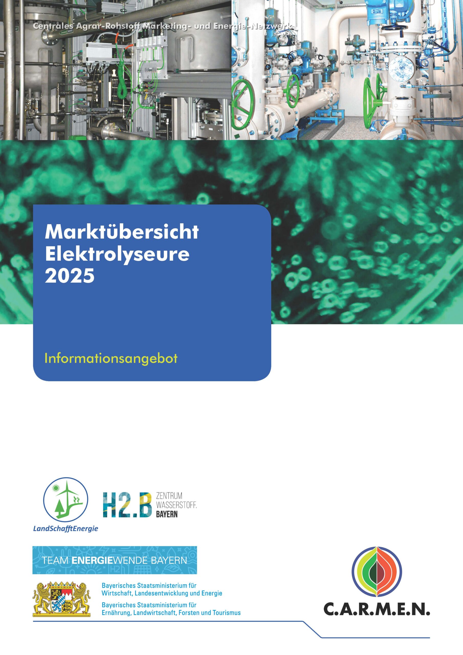 Wasserstoff (H2) gilt als wahres „Multitalent“ und entscheidend für die künftige Dekarbonisierung von energieintensiven Branchen. Um den bestehenden Markt von Herstellern von Elektrolyseuren abzubilden und um ein Informationsangebot aufzubauen veröffentlichte C.A.R.M.E.N. e.V. aufgrund der steigenden Nachfrage nach dem Thema Wasserstoff und dessen Herstellung im April 2021 zum ersten Mal die Marktübersicht Elektrolyseure, die seitdem regelmäßig aktualisiert wird. Im September 2025 wurde das Dokument zuletzt überarbeitet. Die Marktübersicht Elektrolyseure wurde 2025 erstmalig in Zusammenarbeit mit dem Zentrum Wasserstoff.Bayern (H2.B) erstellt.